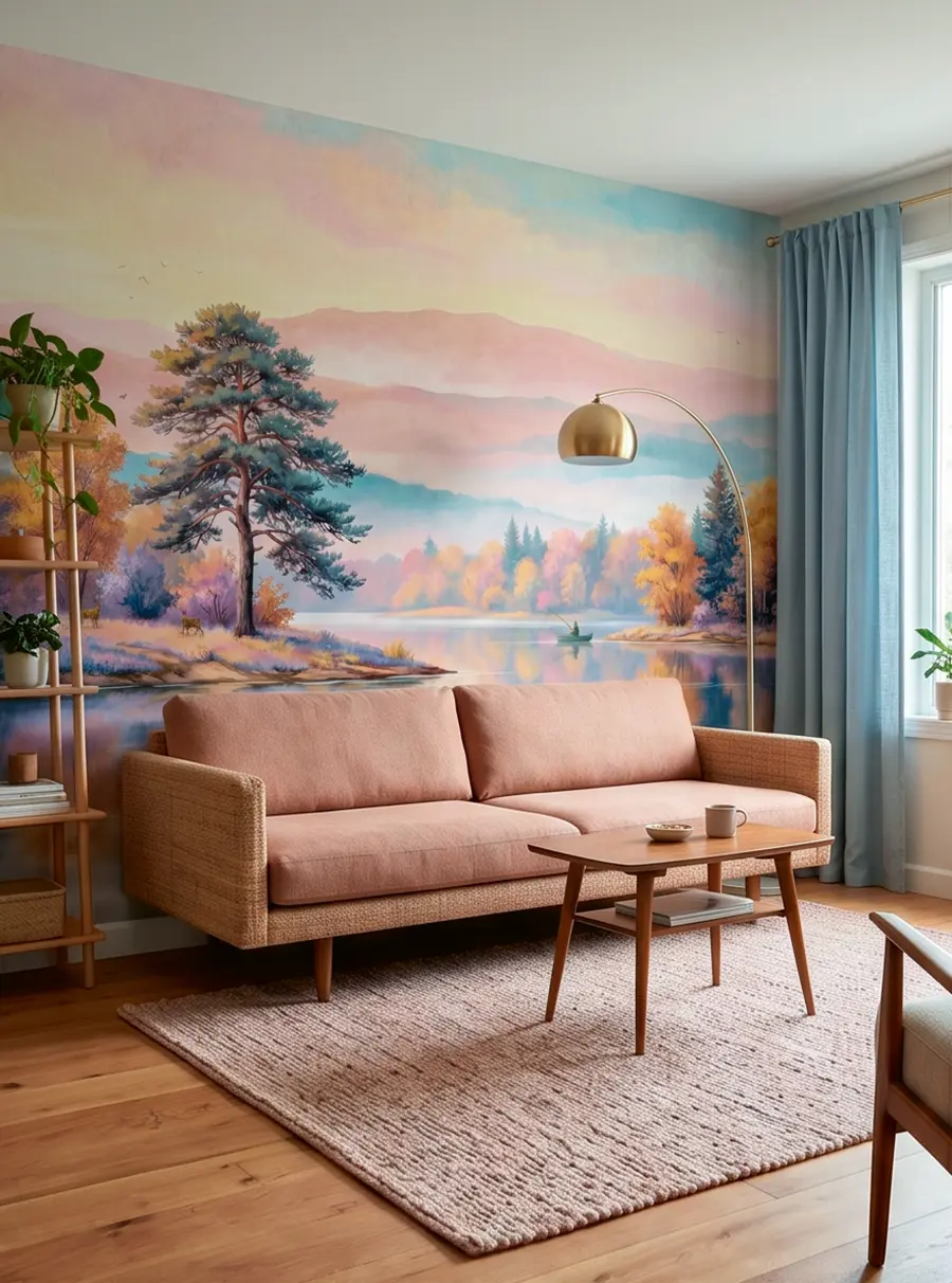 Элегантный природный сюжет с сосной, спокойной водой, мягкими силуэтами гор и осенними деревьями создает в интерьере ощущение тишины, уюта и визуальной глубины. Изображение выглядит благородно и спокойно, поэтому хорошо подходит для помещений, где важны расслабляющая атмосфера и гармония.
