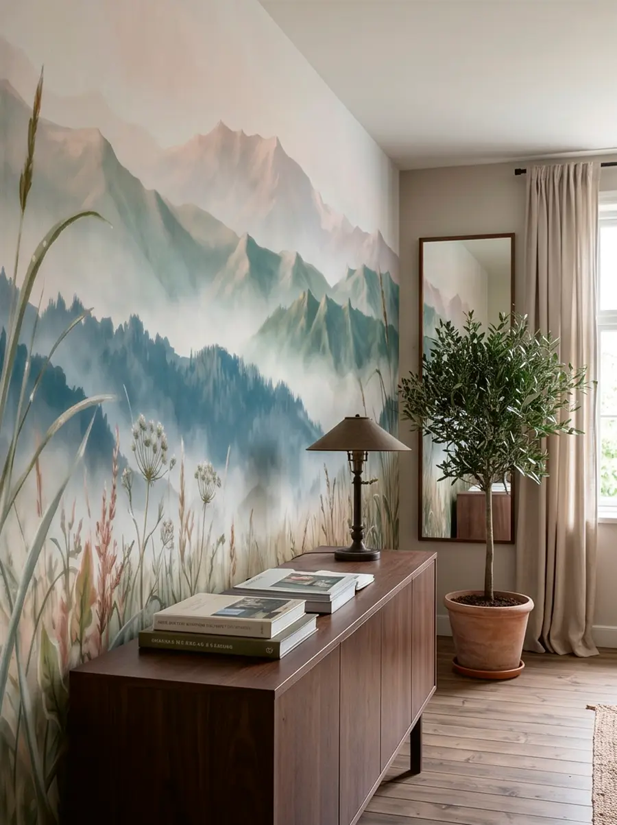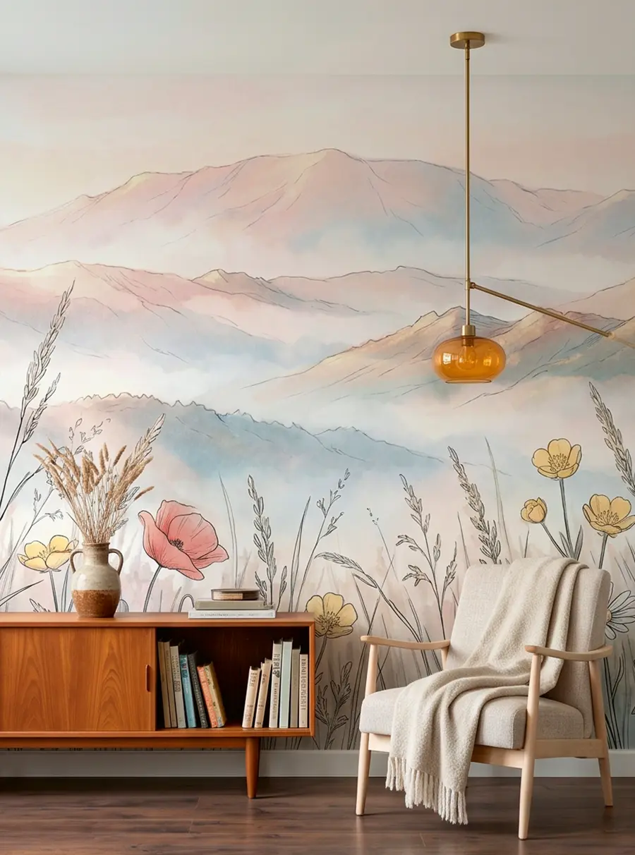 Светлая композиция с горами, полевыми цветами и мягкими пастельными оттенками создает спокойную, уютную и визуально легкую атмосферу в интерьере. Такой сюжет хорошо подходит для помещений, где важны отдых, гармония и ощущение простора.
