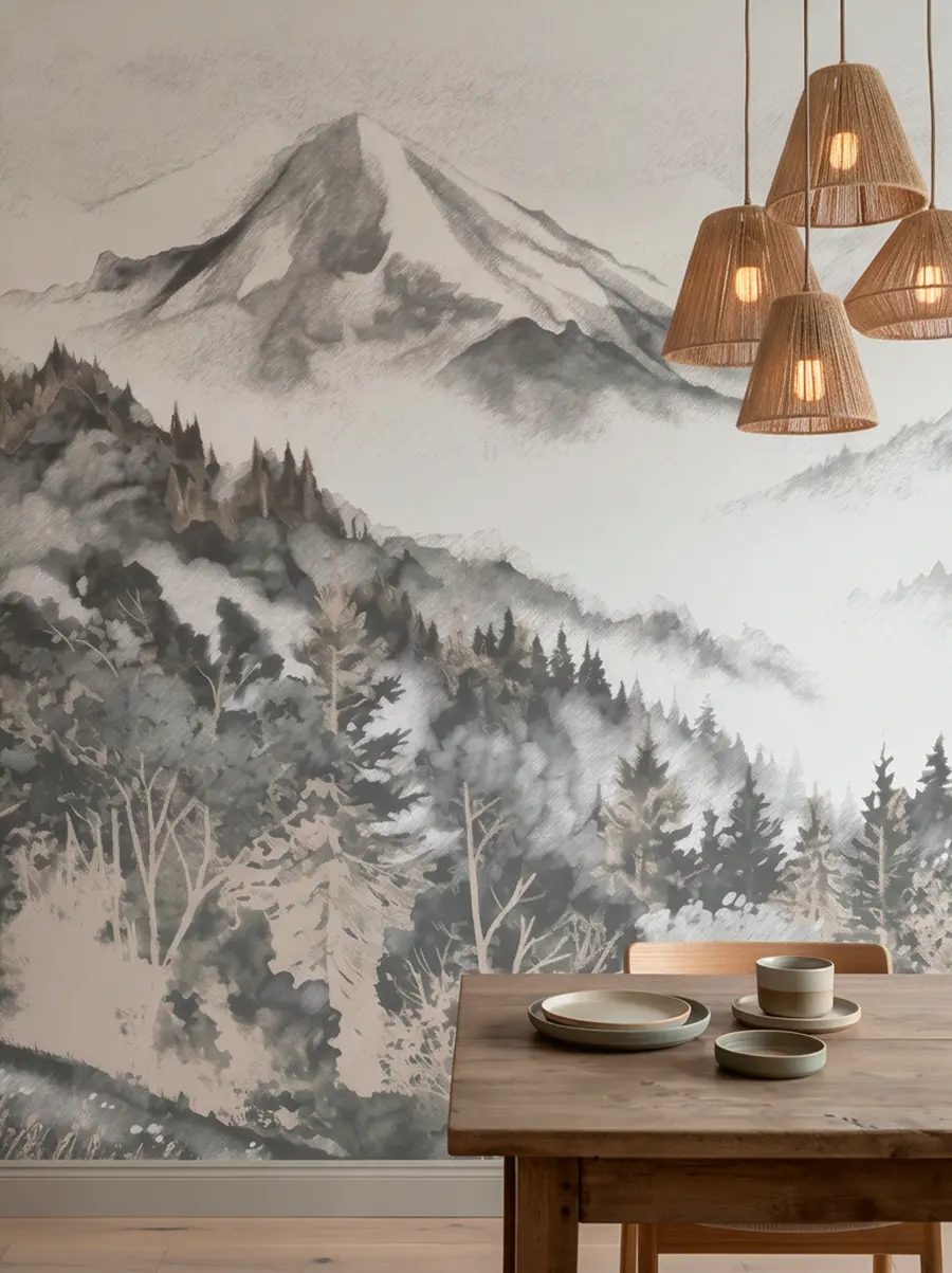 Изображение подходит для гостиной, спальни, кабинета, подростковой комнаты, уютной кухни-гостиной и даже детской в спокойной природной стилистике. Горный пейзаж визуально расширяет пространство и добавляет глубину стене, не перегружая интерьер.