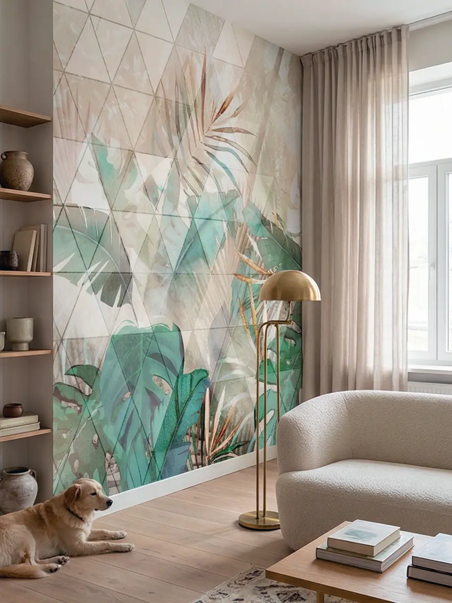 Растительный сюжет выглядит современно и универсально. Такие обои хорошо вписываются в стили japandi, эко, скандинавский минимализм и soft modern. Благодаря легкой дымке, акварельной глубине и полупрозрачным слоям рисунок воспринимается спокойно и расслабляюще.