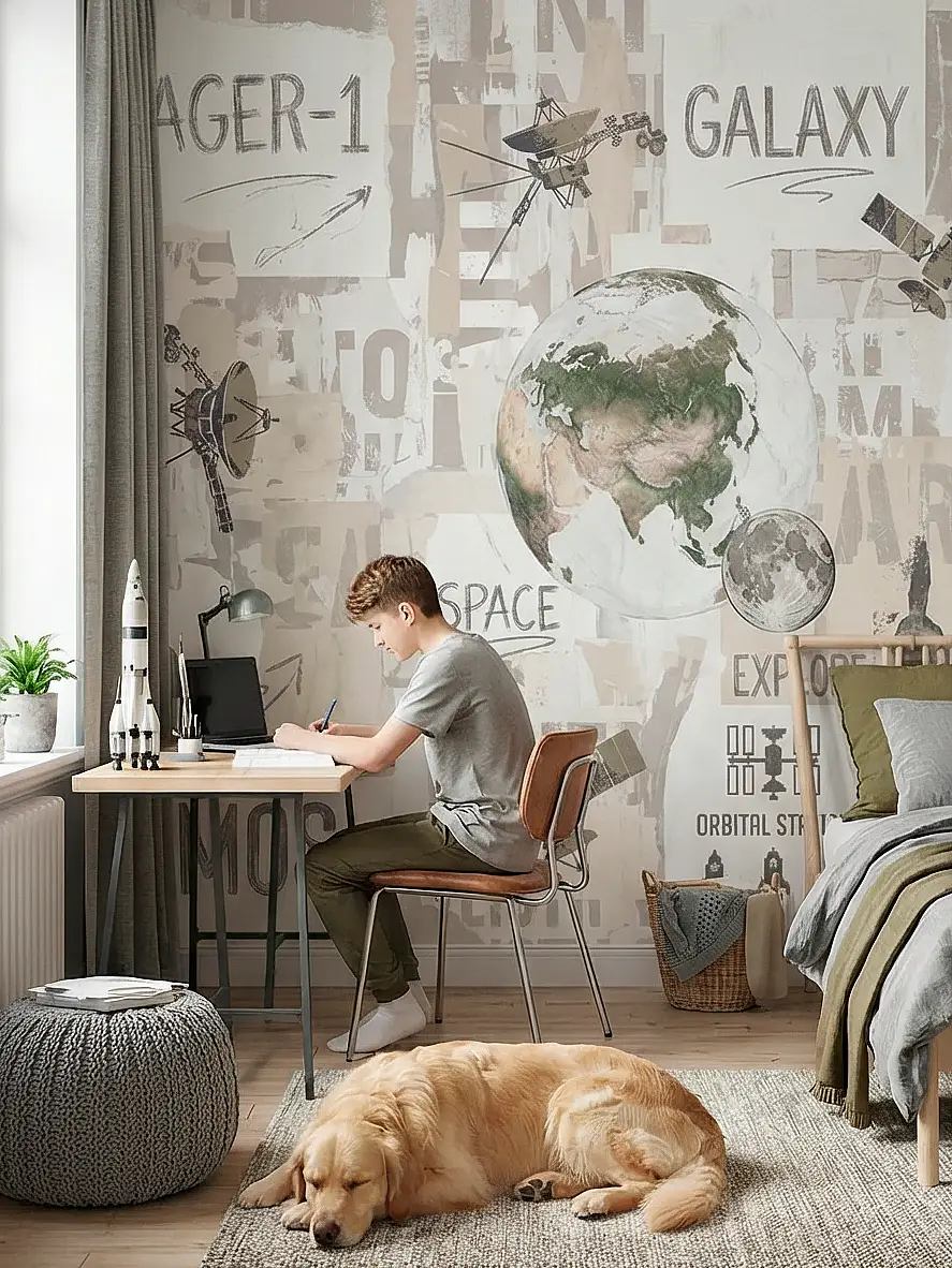 Погрузитесь в атмосферу исследования вселенной с этими винтажно-артовыми фотообоями. Центральный крупный план Земли в сочетании с ручными эскизами астронавта, спутников и ракет создаёт стильный коллаж для детской, кабинета или гостиной. Тёплая пастельная палитра и текстурные наложения добавляют глубины и уюта, сохраняя современный дизайнерский вид.